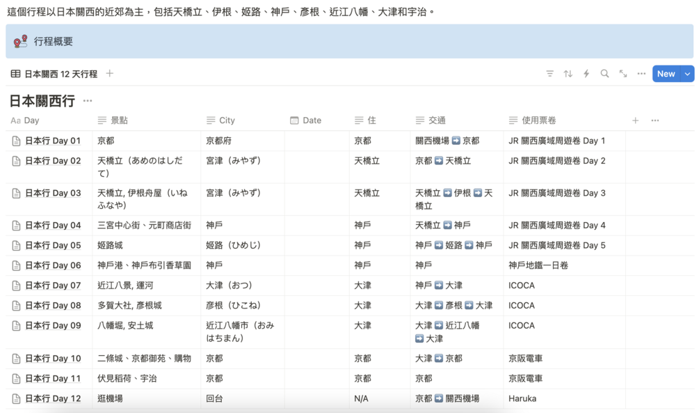 這是我之前去關西玩的行程,主要在近郊遊玩,包括天橋立、伊根、神戶、姬路城、大津和近江八幡,京都的部分只去了二條城、伏見稻荷和宇治。